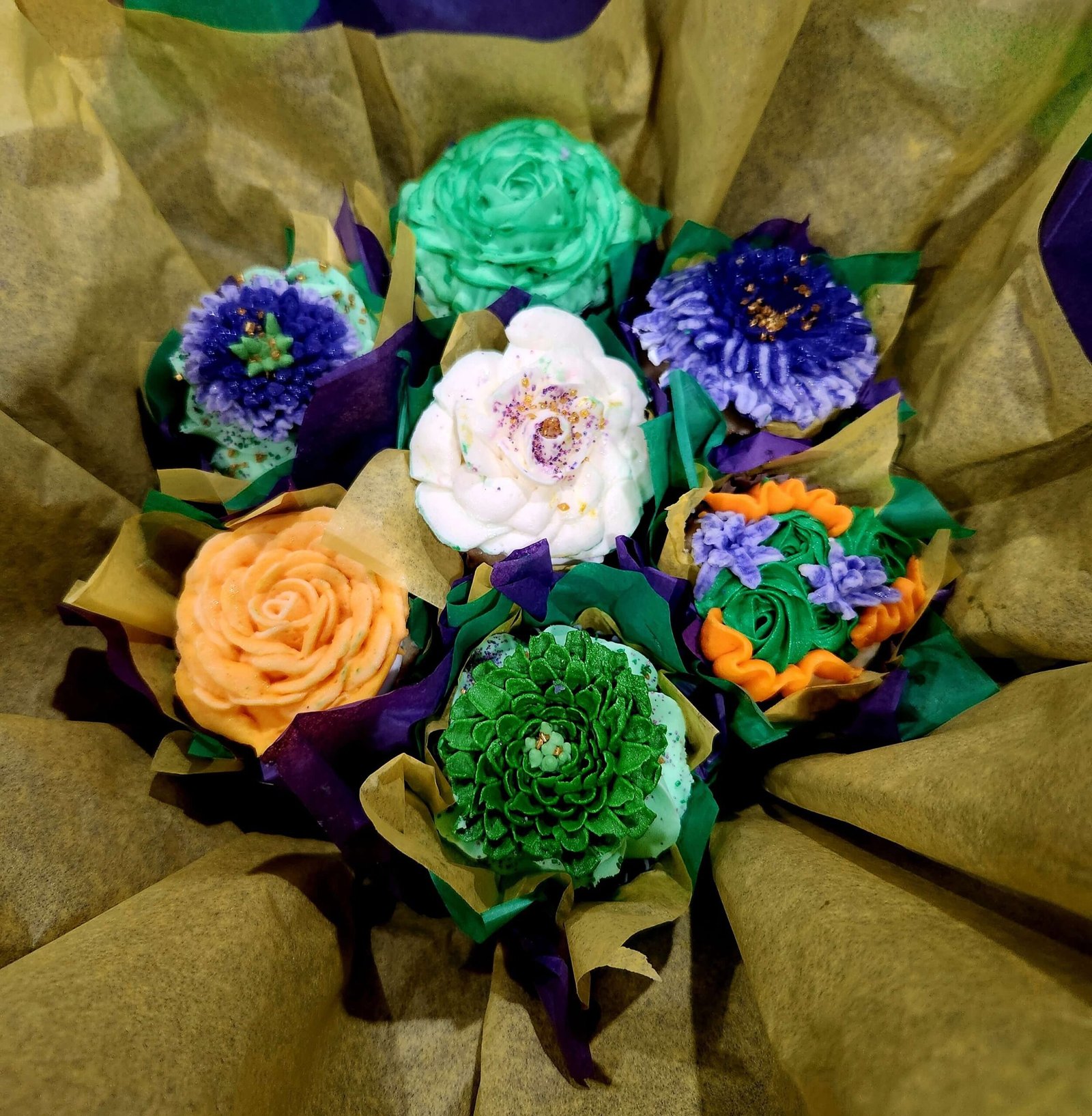 Enjoy our cupcakes with buttercream frosting flowers as a gourmet dessert perfect for celebrations. Have the gourmet floral cupcakes or a gourmet floral cupcake bouquet delivered for holiday celebrations, special occasions or birthday parties. Free delivery on orders over $50 within 20 miles. Extra mileage is $2.50/mile over 20 miles.