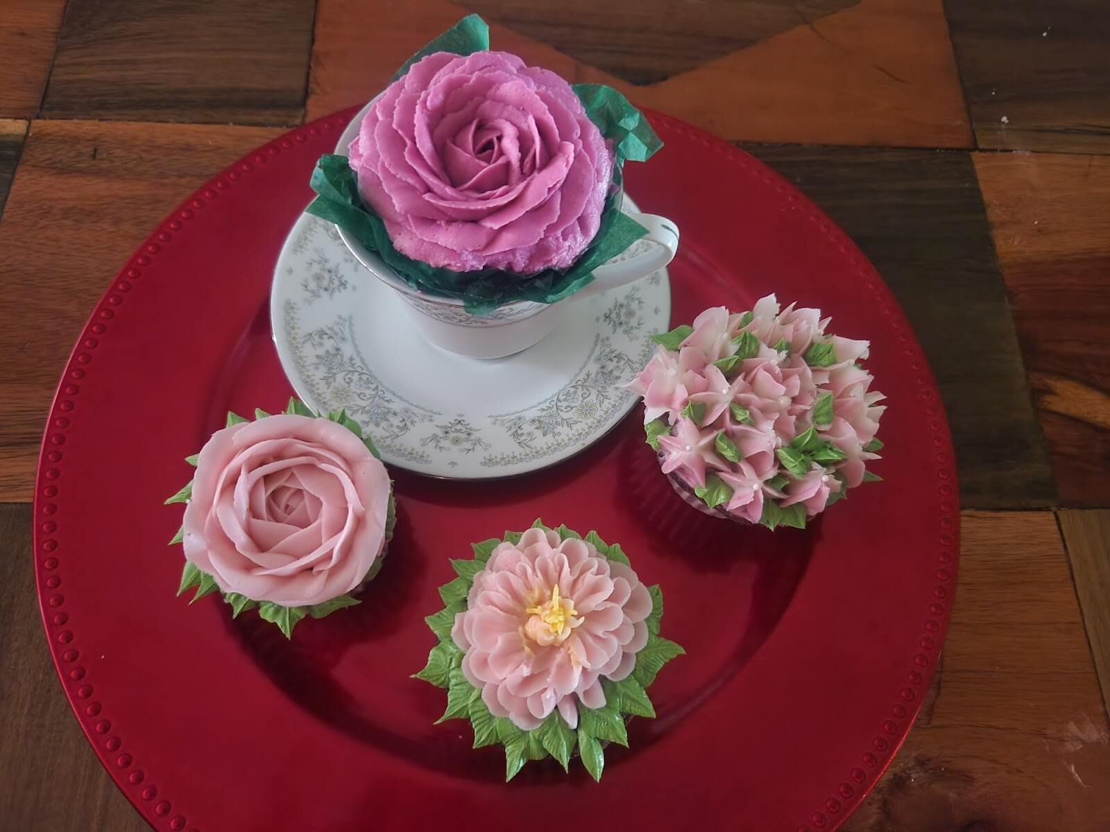 Flavors will determine buttercream colors and decorations. Hand decorated floral cupcakes will generally be in vanilla with your choice of colors. All floral cupcakes are an additional $10/dozen. This does not apply to rosettes.